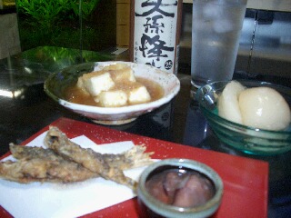 揚げだし豆腐のほかは目光のから揚げと白桃缶、ホタルイカの沖漬け。