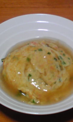 なんちゃってかに玉をごはんの上にのせ、水に中華スープの素を入れ塩コショウと少量の酢で味を調えて、水溶き片栗粉でトロミをつけて上にかければ出来上がり!