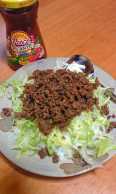 ご飯の上に細く切ったレタスとチーズを乗せ、その上に炒めたひき肉をのせて出来上がり!