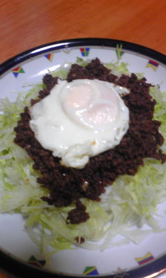赤味噌と水を少々加えて、まろやかになるまでトロ火で火を入れて塩で炒めた挽き肉をくわえ、なじませてレタスをのせたご飯の上に乗せ目玉焼きを乗せたら出来上がり!